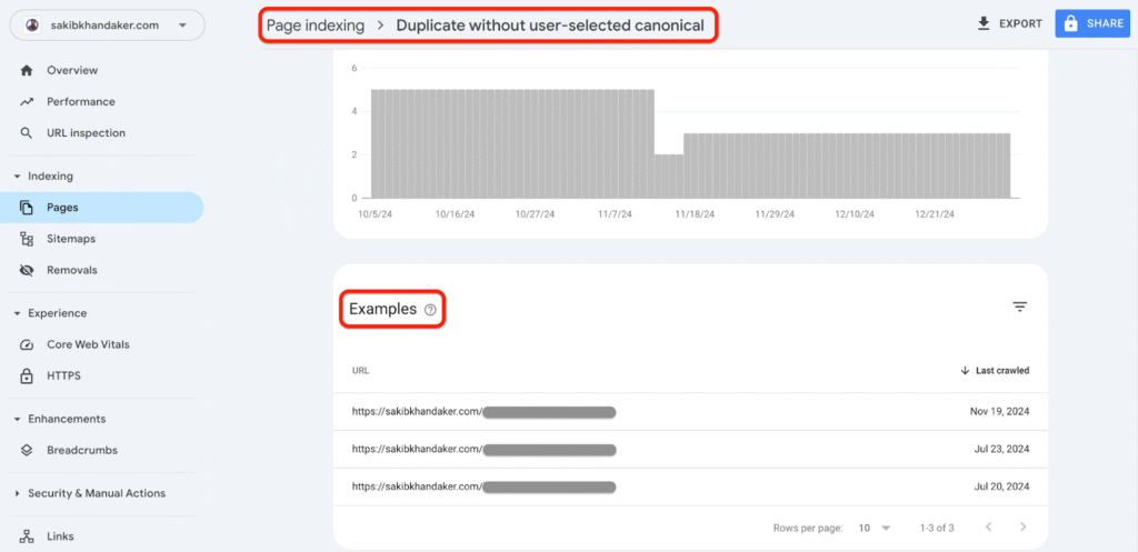 - After you click on Duplicate Without User-Selected Canonical, scroll down to the Examples section to view the list of affected URLs. This will help you understand whether the redirect is intentional or if there are issues, like broken links or incorrect redirect types.