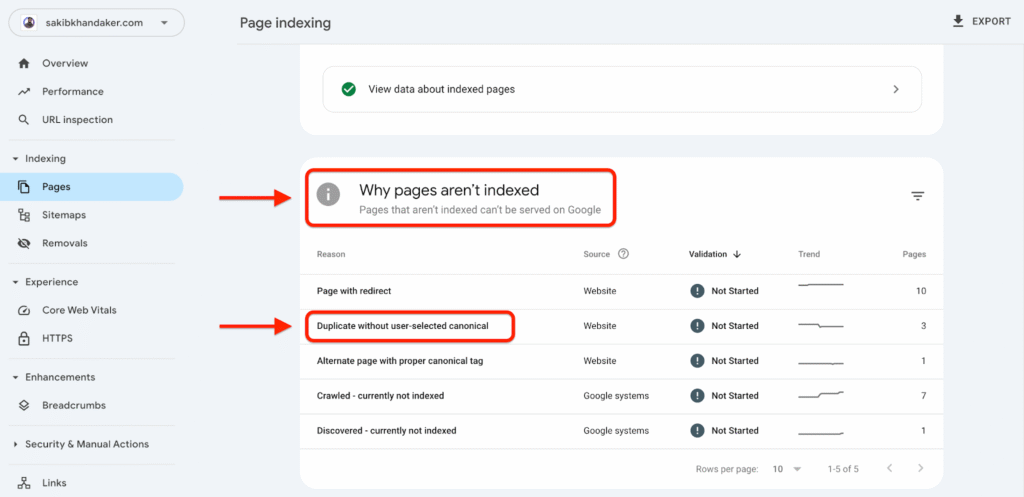 - In the Page indexing report, scroll down to the Why pages aren’t indexed section and look for Duplicate Without User-Selected Canonical. Click on this to see a detailed list of all pages flagged for this reason.