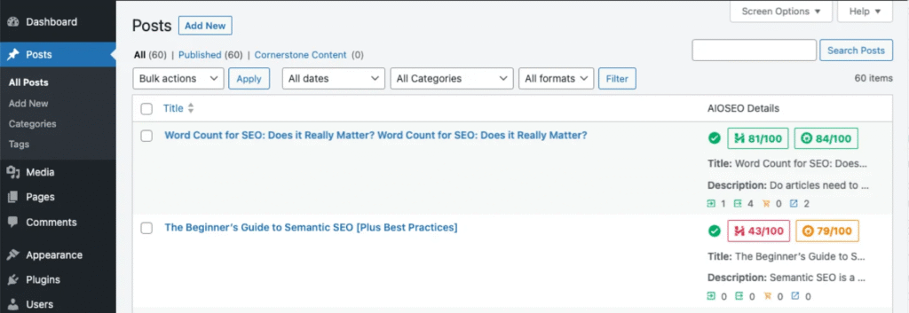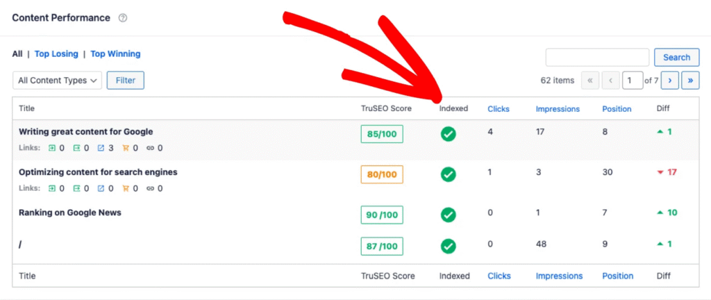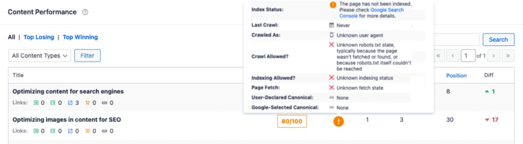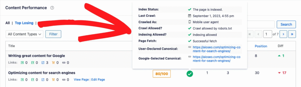 - Alternatively, navigate to the All Posts or All Pages screen in WordPress. The AIOSEO Details column on this page displays the same index status icons as the Content Performance report. Hovering over an icon here will also show details of any errors.