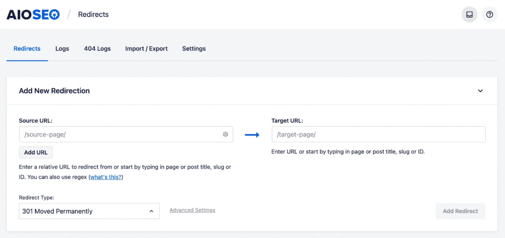 - Navigate to the Redirection Manager in the All in One SEO menu in your WordPress dashboard.