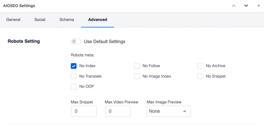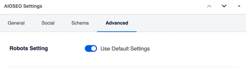 - You'll see a setting for Robots Settings with a toggle that's set to Use Default Settings.