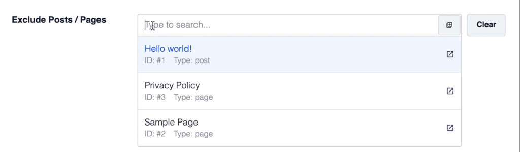 - In the Exclude Posts / Pages field, start typing the title of any post, page or other post type in this field and a drop down will appear that shows matching content.