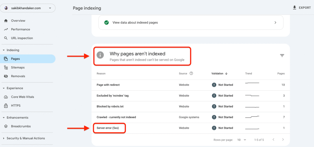 To identify pages with the Server Error (5xx) status in Google Search Console (GSC), follow these steps: