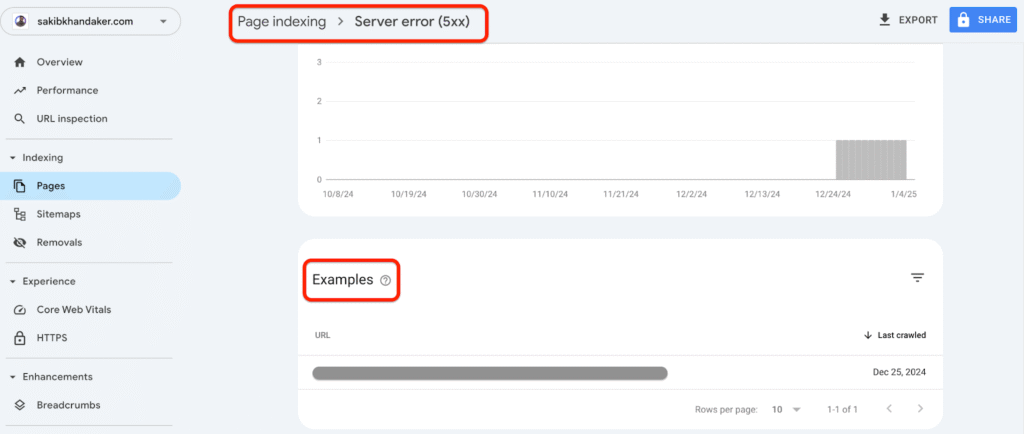 - After you click on Server Error (5xx), scroll down to the Examples section to view the list of affected URLs. This will help you understand whether the redirect is intentional or if there are issues, like broken links or incorrect redirect types.