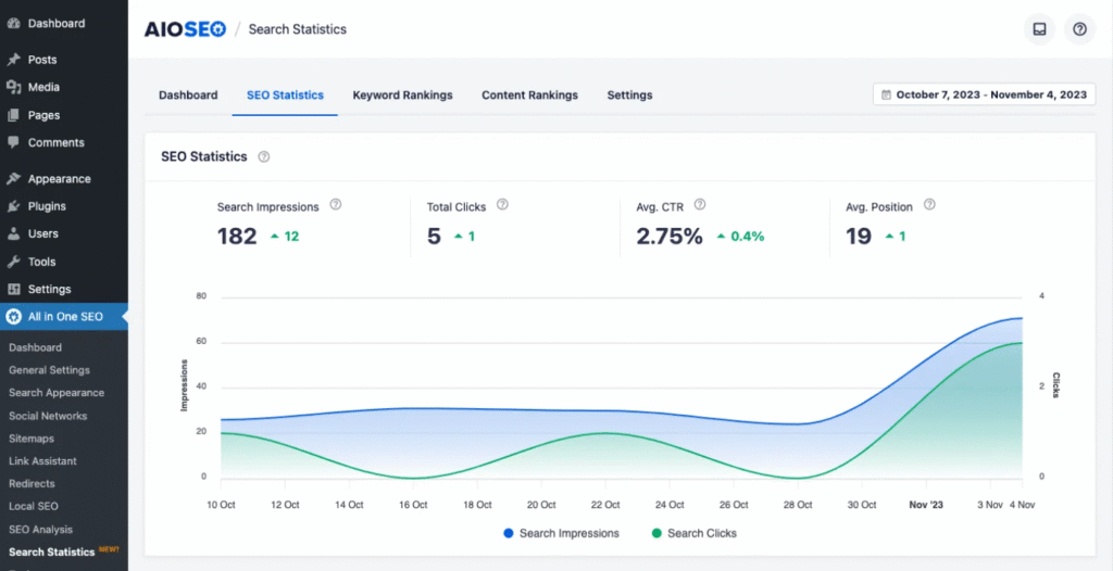 - Click on Search Statistics in the All in One SEO menu and then click on the SEO Statistics tab.