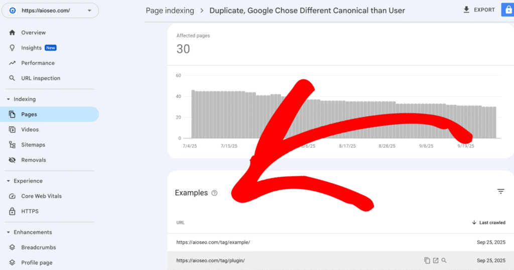 - After you click on Duplicate, Google Chose Different Canonical than User, scroll down to the Examples section to view the list of affected URLs. This will help you to gather the list of the affected pages.