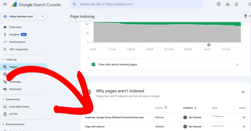 - In the Page indexing report, scroll down to the Why pages aren’t indexed section and look for the Duplicate, Google Chose Different Canonical than User. Click on this to see a detailed list of all pages flagged for this reason.
