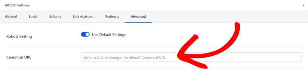 Edit the affected page in WordPress. Scroll down to the AIOSEO Settings section and click on the Advanced tab. Enter the preferred URL in an absolute format, such as https://example.com/preferred-page in the Canonical URL field and save your changes. This ensures that search engines recognize the URL you prefer for indexing. You can learn more about changing canonical URL in our article here.