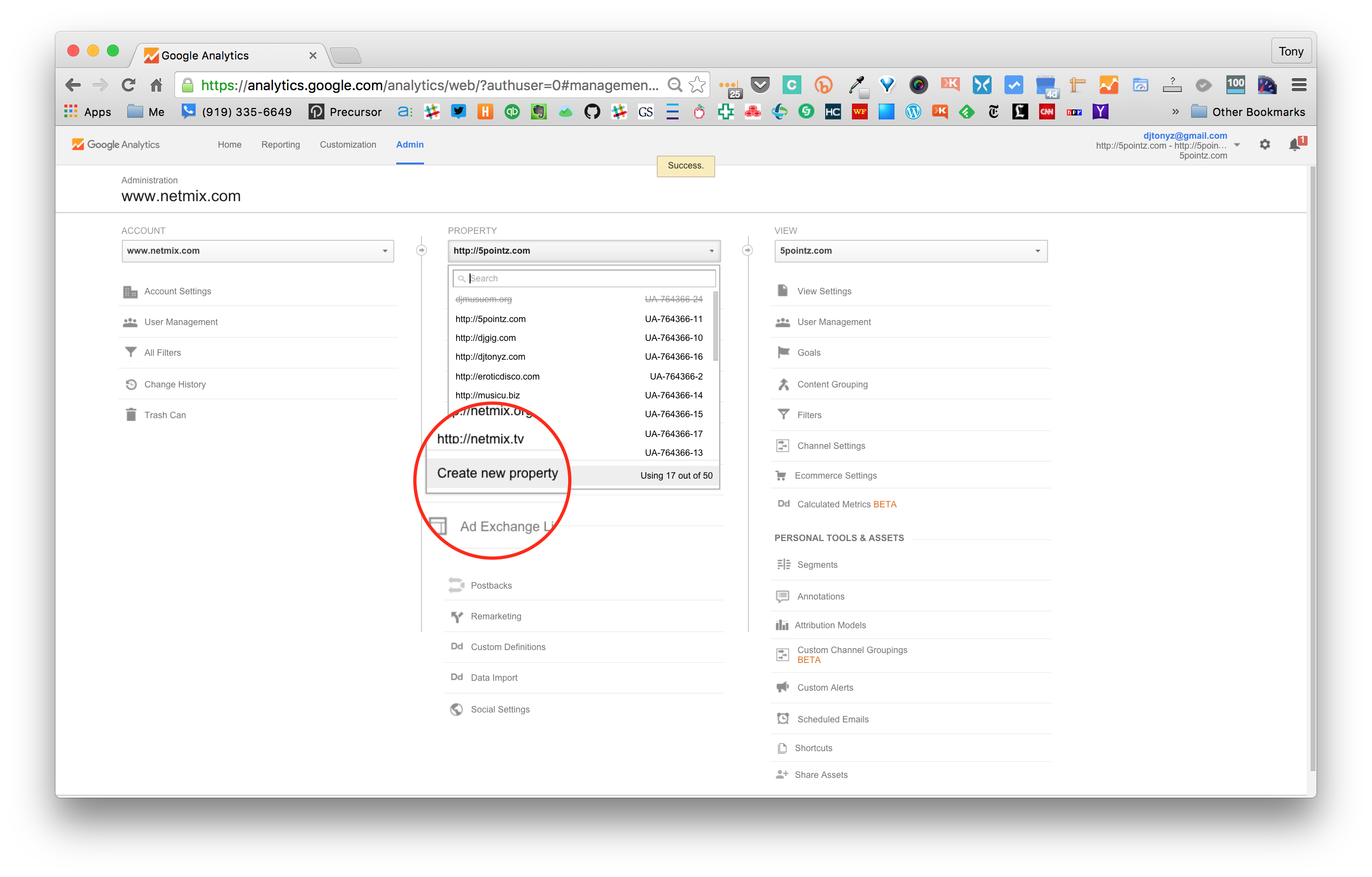 Pour ce tutoriel, nous allons nous connecter à l'un de nos comptes Google Analytics et ajouter un site Web en tant que propriété à notre tableau de bord Google Analytics. Une fois connectés, nous naviguons vers Admin, puis nous nous concentrons sur la colonne centrale Propriété. Dans le sélecteur déroulant, nous cliquons sur Créer une nouvelle propriété.