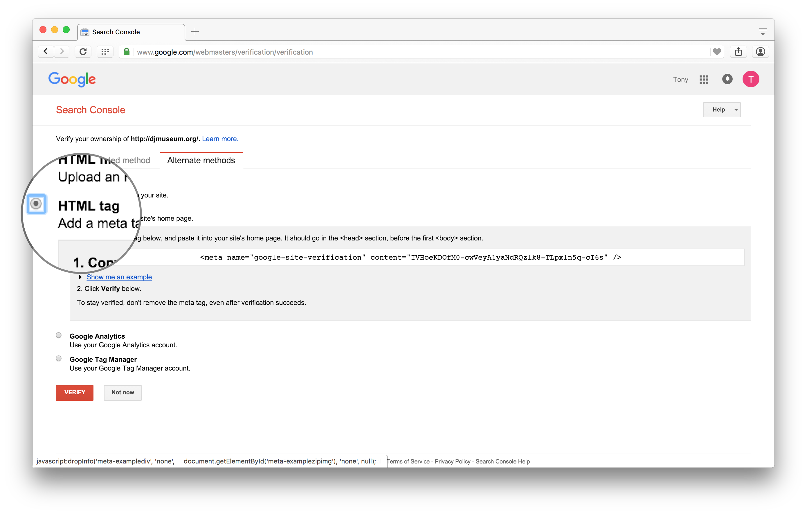Para este tutorial, nós enviamos um domínio inativo que tínhamos guardado: djmuseum.org. Usar um domínio ativo ilustra melhor como verificar um site WordPress com diferentes métodos de verificação oferecidos pelo Google Search Console, incluindo nossos processos de verificação do All in One SEO Pack e Google Search Console.
