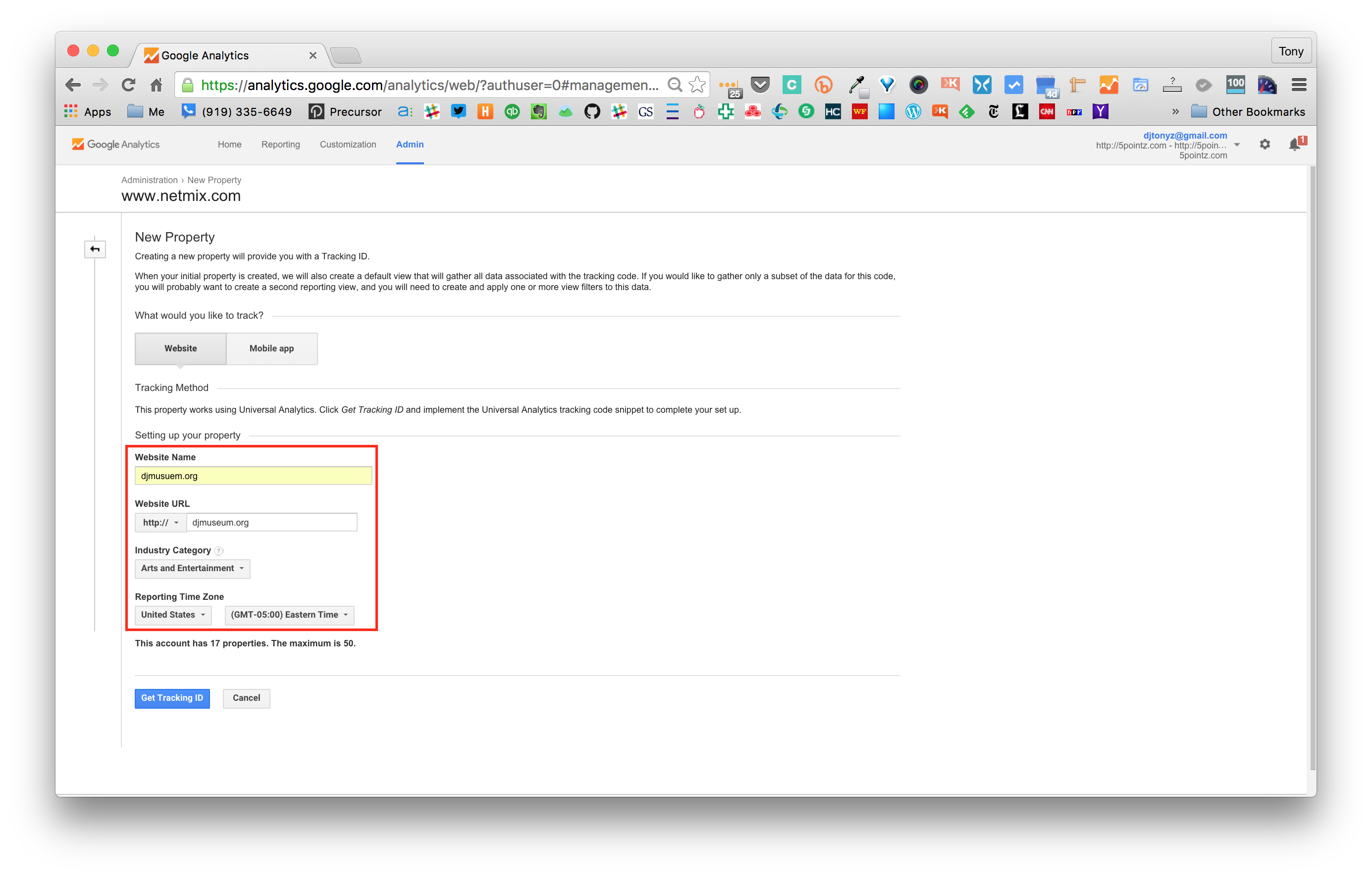 Google Analytics Create New PropertyNext, we'll fill in the Property details. We'll enter our website name (for this exercise, we simply entered: djmuseum.org). Then, we can enter the Website URL. We can also choose an Industry Category and our Reporting Time Zone. We then click the blue “Get Tracking ID” button to obtain our UA (Universal Analytics) number.