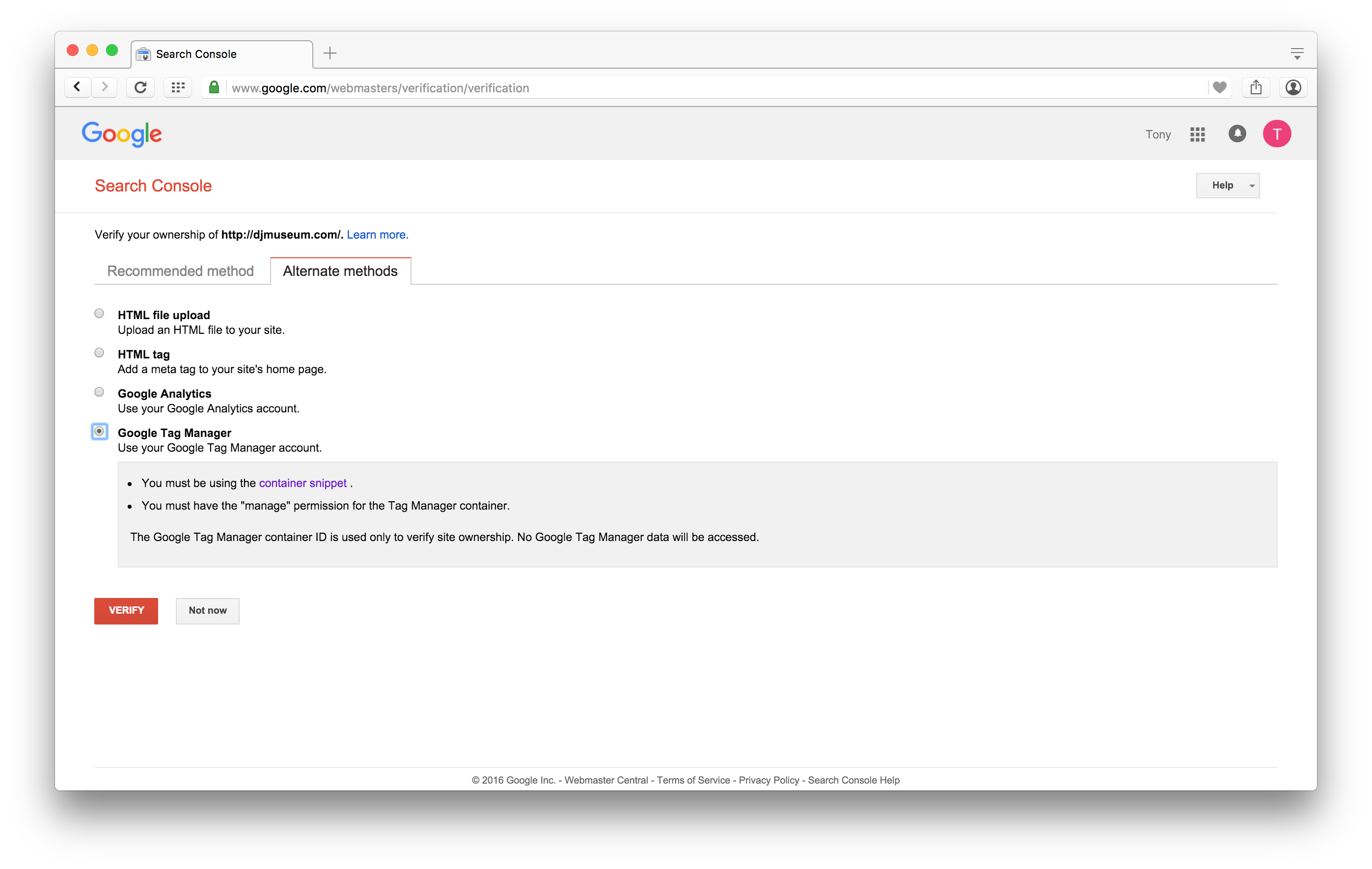 Screenshot of Google Search Console Google Tag Manager Verify Screen